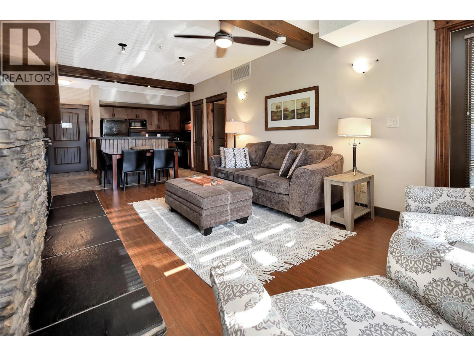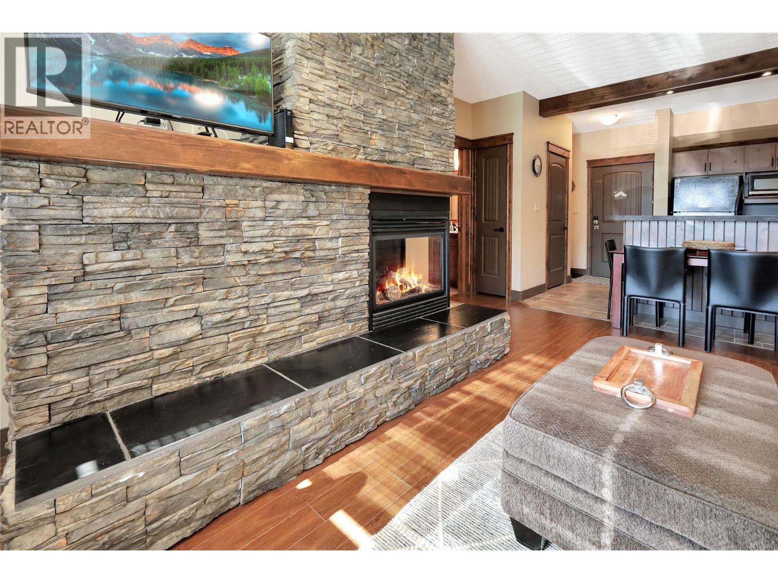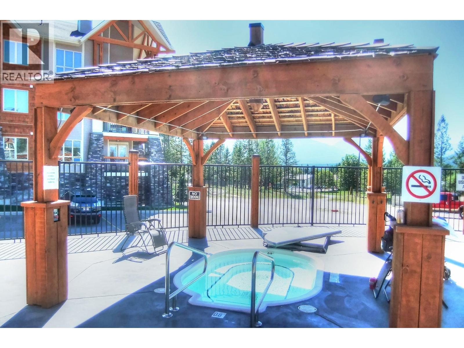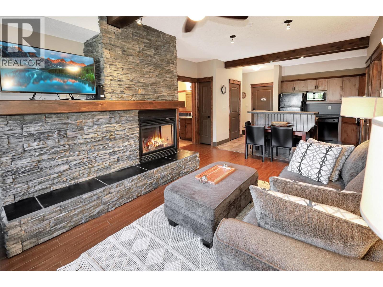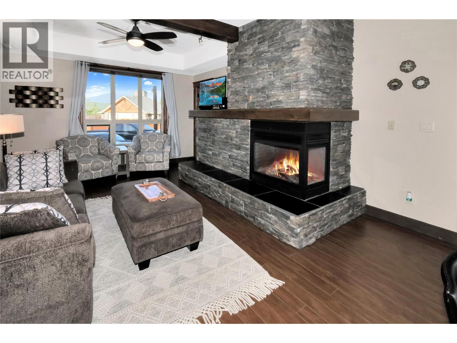 Welcome to your new retreat in the mountains! Experience the perfect blend of comfort and luxury in this stunning ground-level condo at Sable Ridge. This fully furnished, two-bedroom, two-bathroom unit is designed for both relaxation and entertaining, featuring an open-concept kitchen, dining, and living area. The sleek gas fireplace with its beautiful stone hearth creates a warm and inviting atmosphere, complemented by soaring 9-foot ceilings and gorgeous wood and stone details throughout. Furnace/AC 2023. The spacious primary bedroom includes a four-piece ensuite, and a versatile den provides extra space for work or guests. Additional sleeping is available on the living room pull-out couch, ensuring plenty of room for family and friends. Step outside onto your private, slightly elevated balcony, offering a quiet, serene view of the clubhouse, terrace, and seasonal pool. The year-round gazebo hot tub is just steps away, perfect for unwinding after a day of adventure.1 Enjoy exclusive access to the clubhouse, with a kitchen available for private events, along with the convenience of one indoor heated parking stall and a storage locker. Located within walking distance of Radium Hot Springs' main street, you’re just moments from dining, shopping, and community events.2 Spend your days exploring the best of the Rockies—whether it's skiing, golfing, biking, or hiking—and come home to your personal oasis. This isn't just a condo; it's your gateway to the mountain lifestyle. (id:4069)